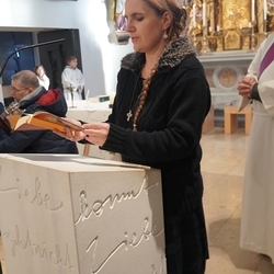 Vor dem Schlusssegen überreichte Ernst Pock im Namen der Pfarre dem neuen Diakon ein Aspergill, mit dem dieser gleich voll Freude die Gläubigen segnete. Für seine Ehefrau Eva, die ihm begleitend zur Seite steht, gab es einen Blumenstrauß, mit den besten Wünschen für sie.